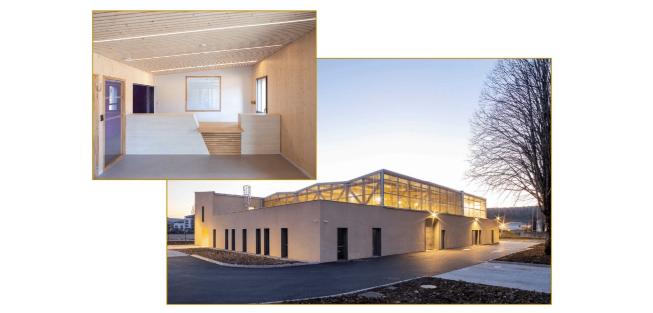 Client Commune d’Orgelet MOEx HOMM Architecte CARTALLIER Architectes Chiffres Date de livraison : 2025 | Surface : 522 m² | Coût HT : 844 378,00 € H.T. | Durée du chantier : 8 mois Travaux réalisés Construction d’un bâtiment en charpente bois et enveloppe textile.